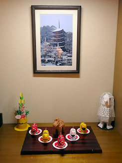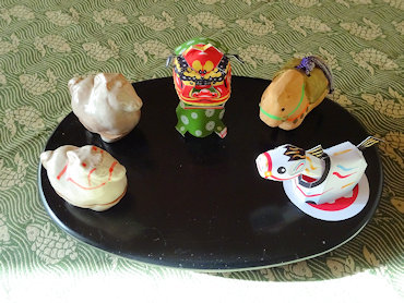 座敷のテーブルの上・・・・いつもms.TANUKI が花を飾っていますが、ここには母親ダヌキが集めていた干支の香合とペーパークラフトとを飾ってみました。ちょっと良い雰囲気になったかな・・・? |