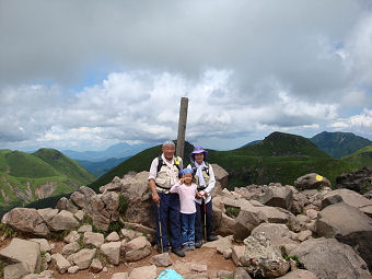 チビダヌキを連れて久住山登頂! くじゅうの神様も、すばらしい天気と眺めで歓迎してくれました |